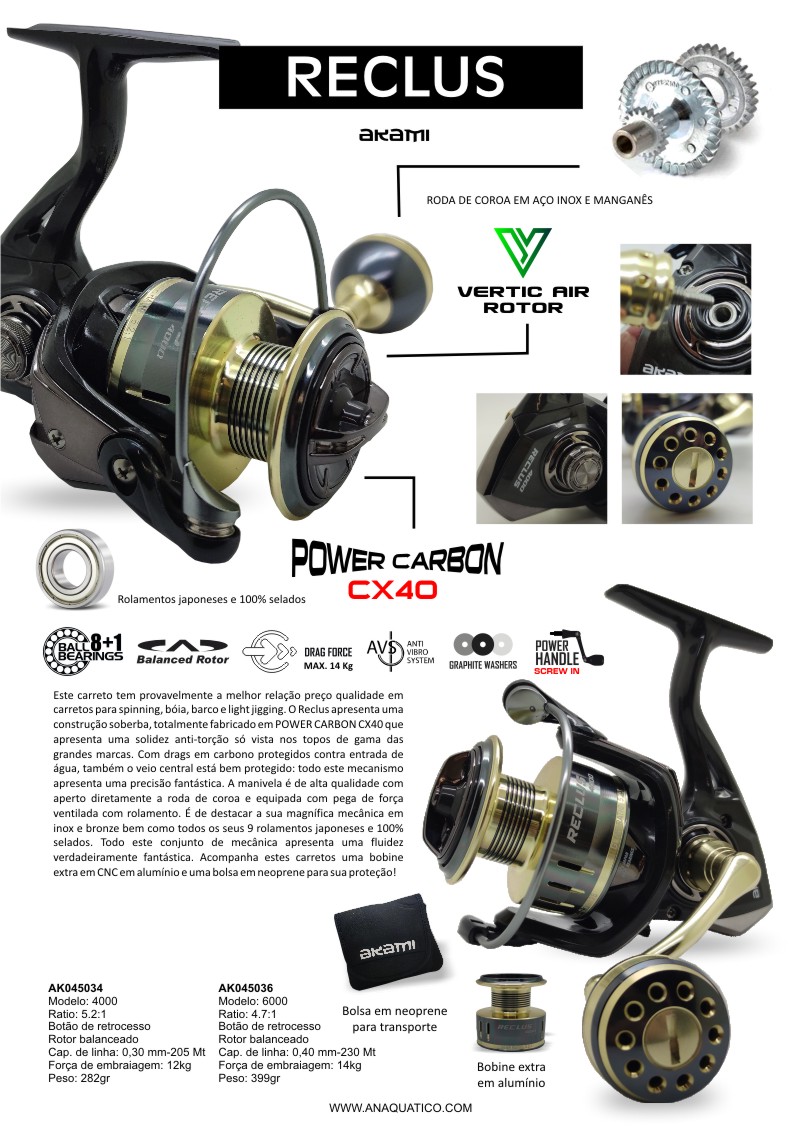 Este carreto tem provavelmente a melhor relação preço qualidade em carretos para spinning, bóia, barco e light jigging. O Reclus apresenta uma construção soberba, totalmente fabricado em POWER CARBON CX40 que apresenta uma solidez anti-torção só vista nos topos de gama das grandes marcas. Com drags em carbono protegidos contra entrada de água, também o veio central está bem protegido: todo este mecanismo apresenta uma precisão fantástica. A manivela é de alta qualidade com aperto diretamente a roda de coroa e equipada com pega de força ventilada com rolamento. É de destacar a sua magnífica mecânica em inox e bronze bem como todos os seus 9 rolamentos japoneses e 100% selados. Todo este conjunto de mecânica apresenta uma fluidez verdadeiramente fantástica. Acompanha estes carretos uma bobine extra em CNC em alumínio e uma bolsa em neoprene para sua proteção!